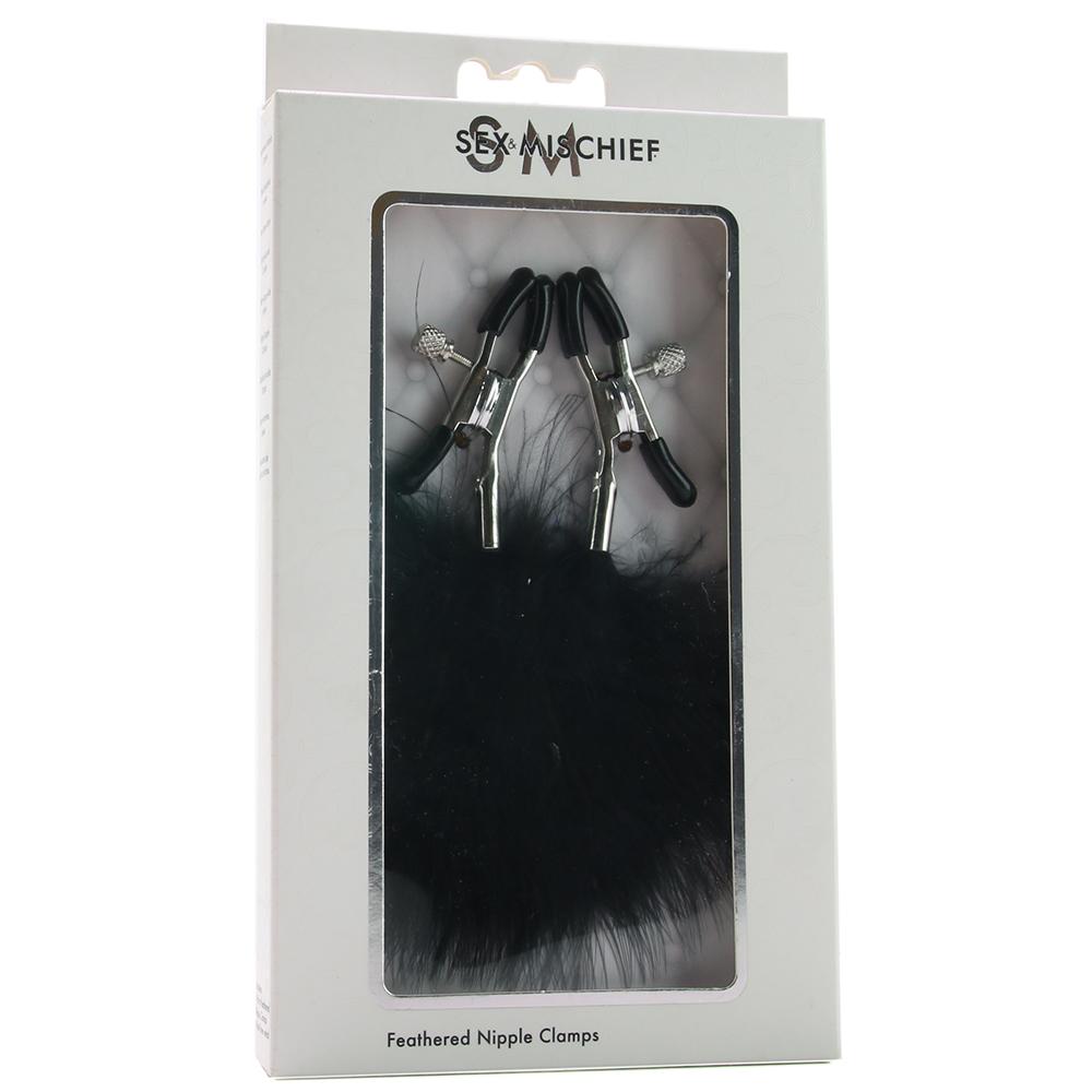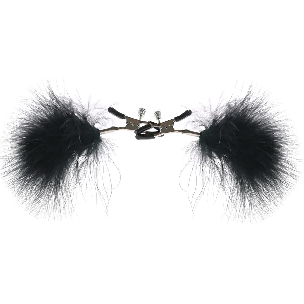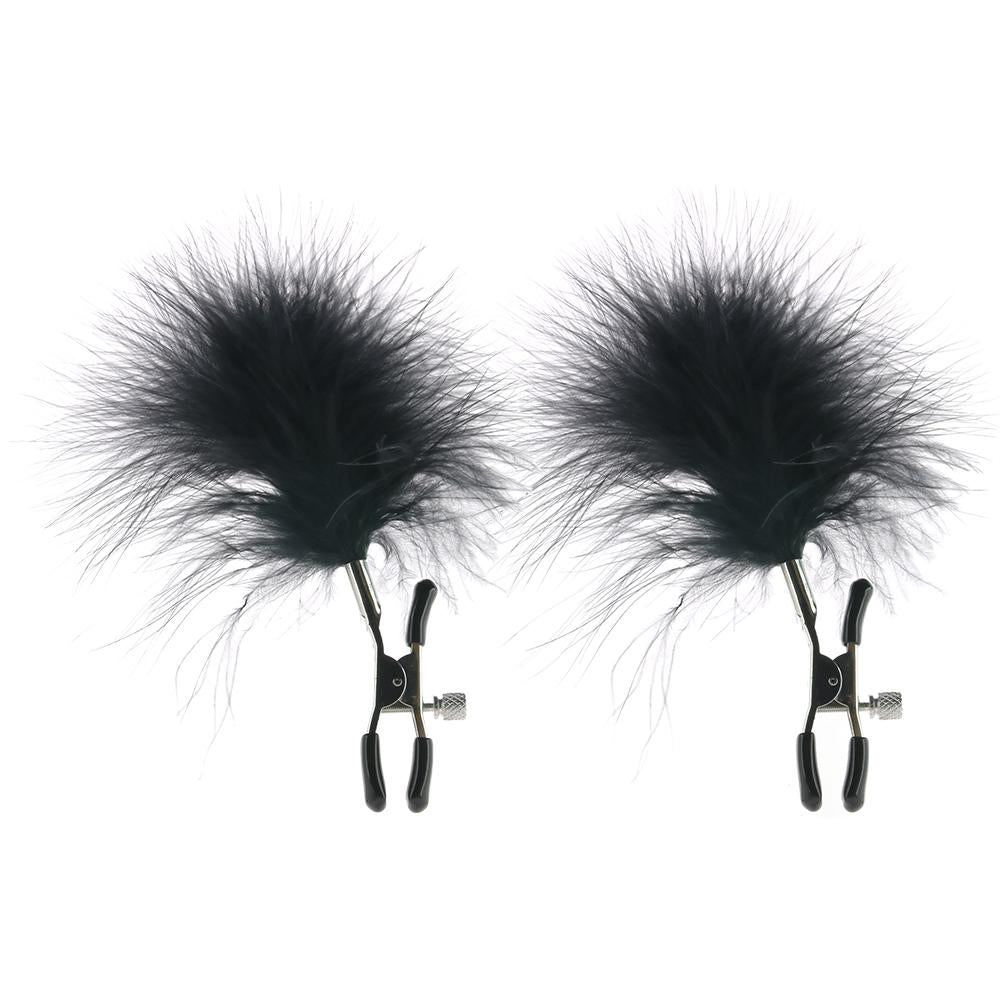 A drop-dead gorgeous pair of nipple clamps from Sex & Mischief, these dreamily soft feathered clamps easily and perfectly perk up at least two erogenous zones. Tipped in smooth rubber, the hardy metal grips are completely adjustable in terms of tension, simply twist the screw to widen or narrow their grasp. Once in place, the silky black rooster feathers float dazzlingly, effortlessly hypnotizing your playmate while awakening desire and increasing sensation. Nickel free