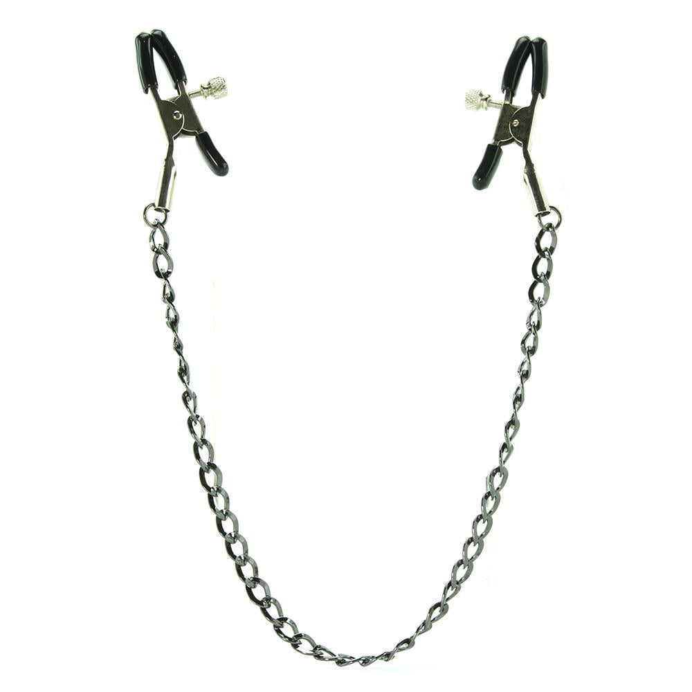 Classically styled and easy as pie to adjust, the First Time Clamps have fully customizable tension for a more gentle or deliciously firm grip, and the rubber coated tips make for a comfortable feel, although you could also remove them for a more intense 'bite.' Attached by a length of sturdy gunmetal chain that adds some weight for even more stimulation, the total stretch of the clamps is just over 14 inches.