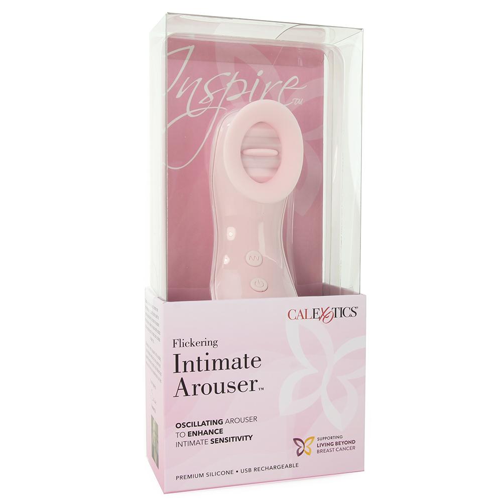 Ergonomically curved to provide comfortable handling and precision placement, the Inspire Collection's Flickering Intimate Arouser was thoughtfully designed to indulge clitoral pleasure cravings. Angled naturally forward on its smooth handle, a big silicone cup waits to thrill the sweetest of spots with ten rhythms of vibration and a namesake flickering tongue.