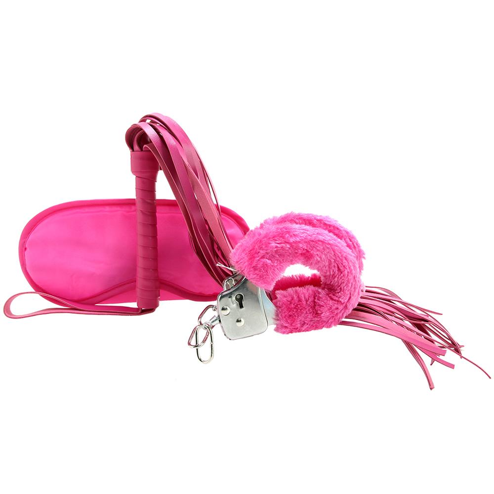 Open up the pretty packaging to find three bright pink bondage mainstays; a pair of plushy faux fur-lined cuffs, a soft satin eye mask, and a classic flogger.