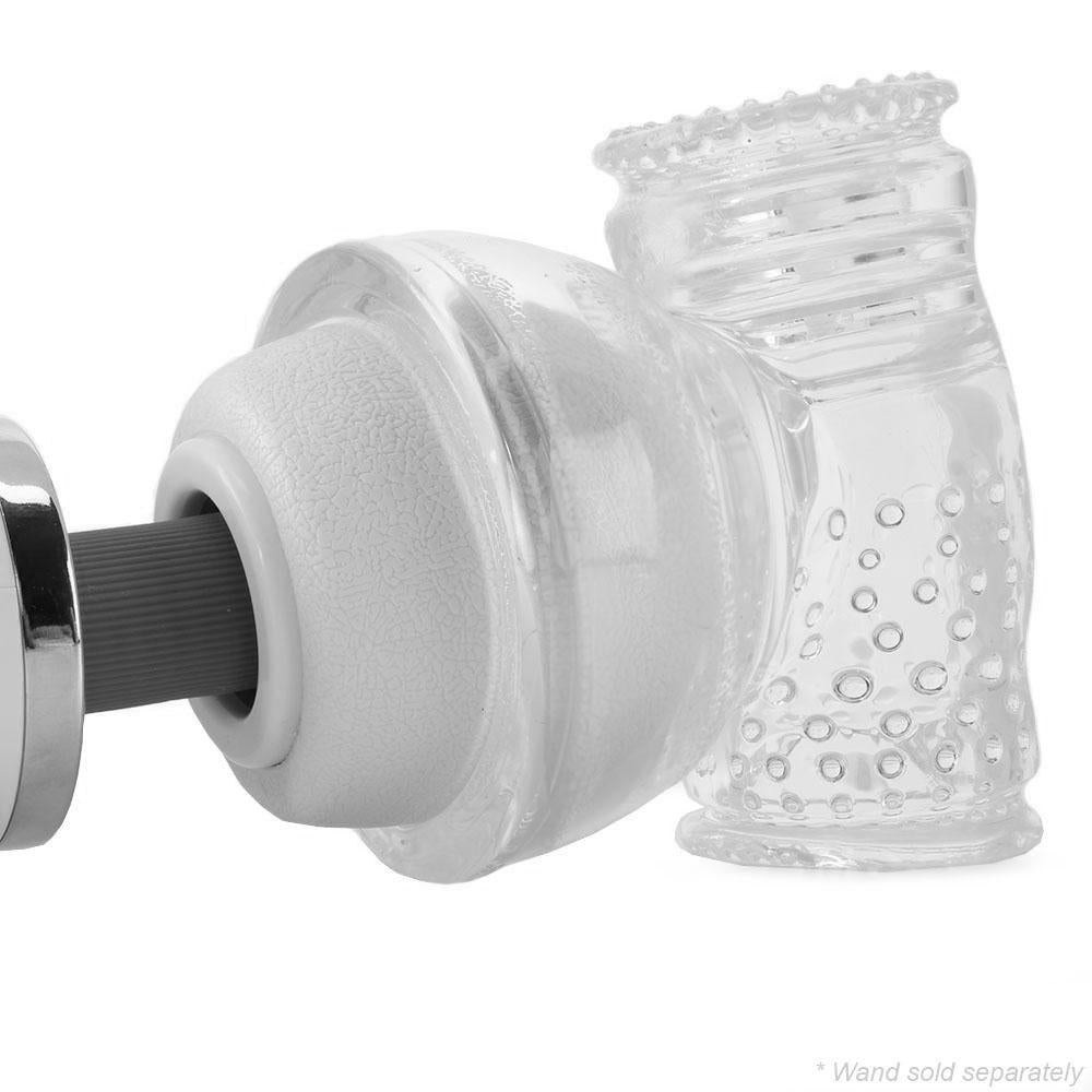 Supple and sexily transparent, allowing for excitingly voyeuristic opportunities, the Accessory sits atop the wand, offering an amazingly textured soft cylinder to masturbation and/or foreplay. Ribbed at one side and lined in teasing nubs at the other, the Stroker provides distinct sensations depending on which end is entered. Regardless, the insane power of the Massager buzzes steadily right through, transmitting toe-curling intensity straight to points of body contact.