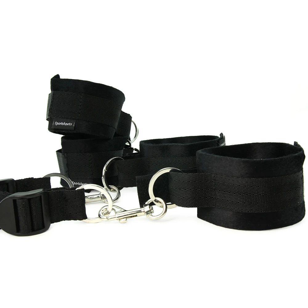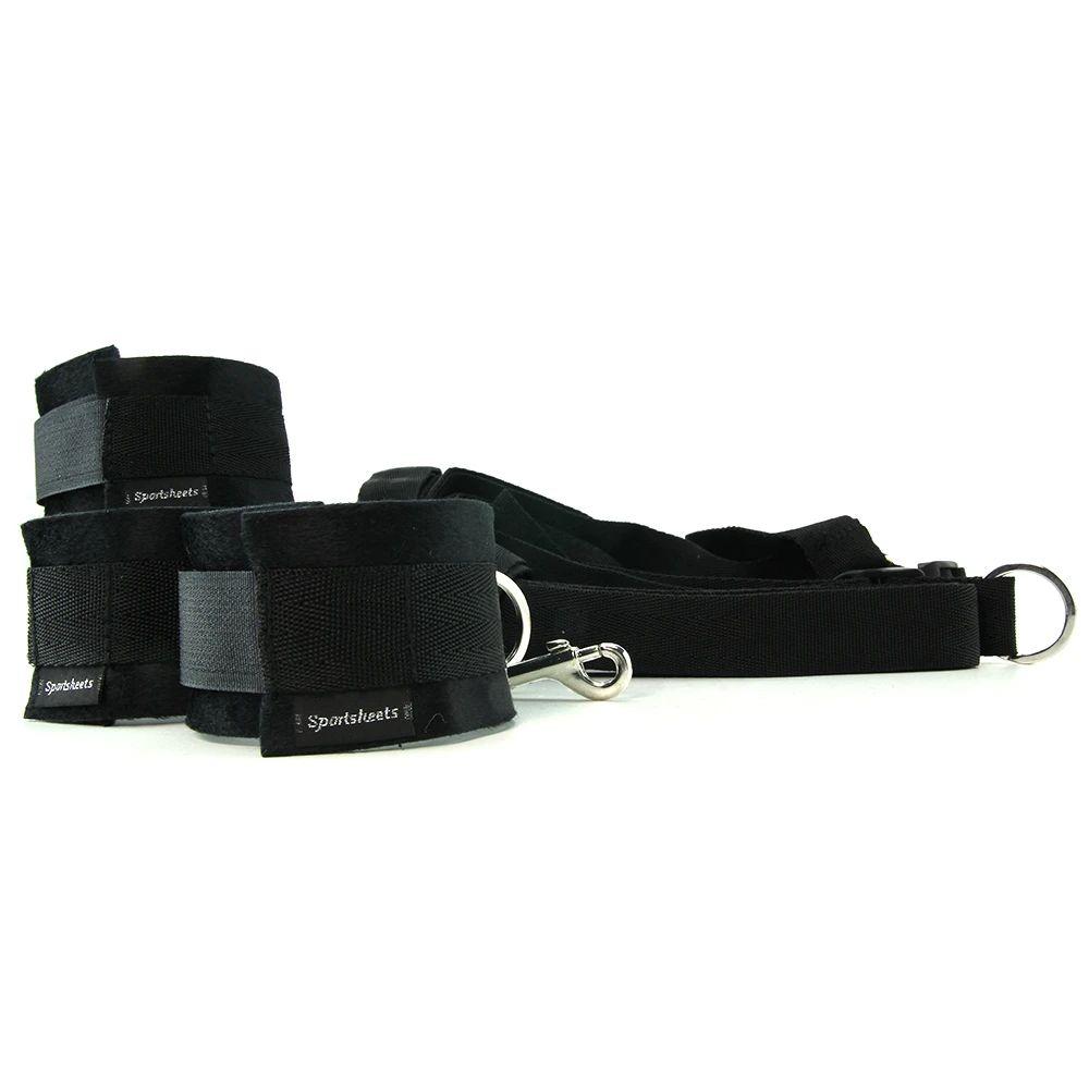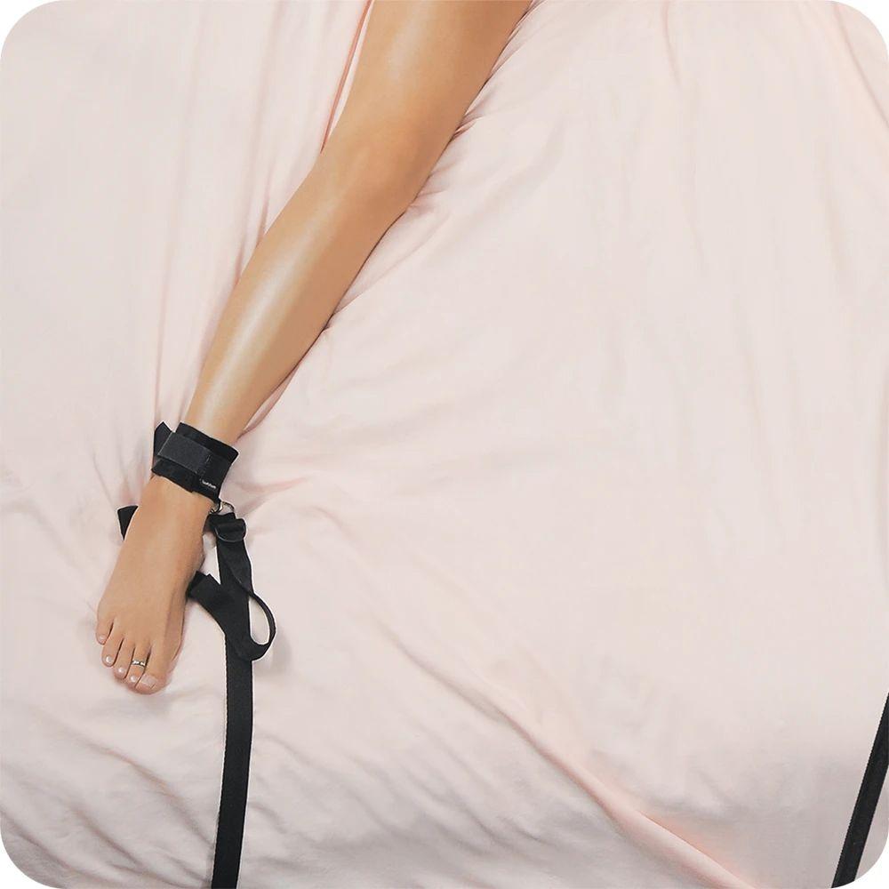 Fitting quickly beneath the mattress, this set's adjustable main strap can be placed lengthwise or across the width of the bed. Each of four felted cuffs clip to corresponding O-rings at the tip of four tethers via rugged swiveling metal clasps. Two on top capture the wrists while the lower two secure the ankles- each tether is adjustable.
