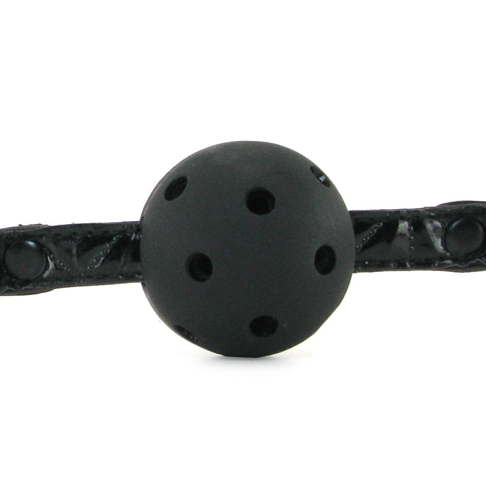 The ultra firm, perfectly perforated ABS plastic ball is 5 3/4 inches around, definitely a mouthful, and the shiny vinyl strap has lots of room for adjustment. Nickel free.