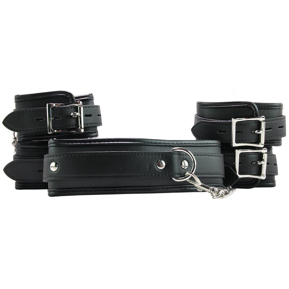 Cuffs and collar are lined for cushy comfort- all feature a sturdy nickle free metal buckle with the option to lock (you'll need a padlock, which is not included) it into position. Cuffs and collar each also feature a nice big D ring for connection to the included chain, each other, or any other compatible bondage gear.