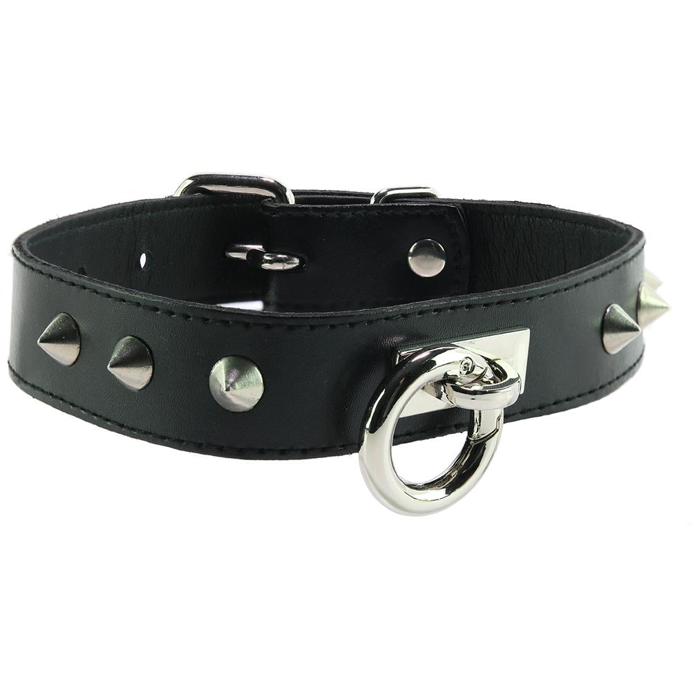 Studded Leather O-Ring Collar in Black