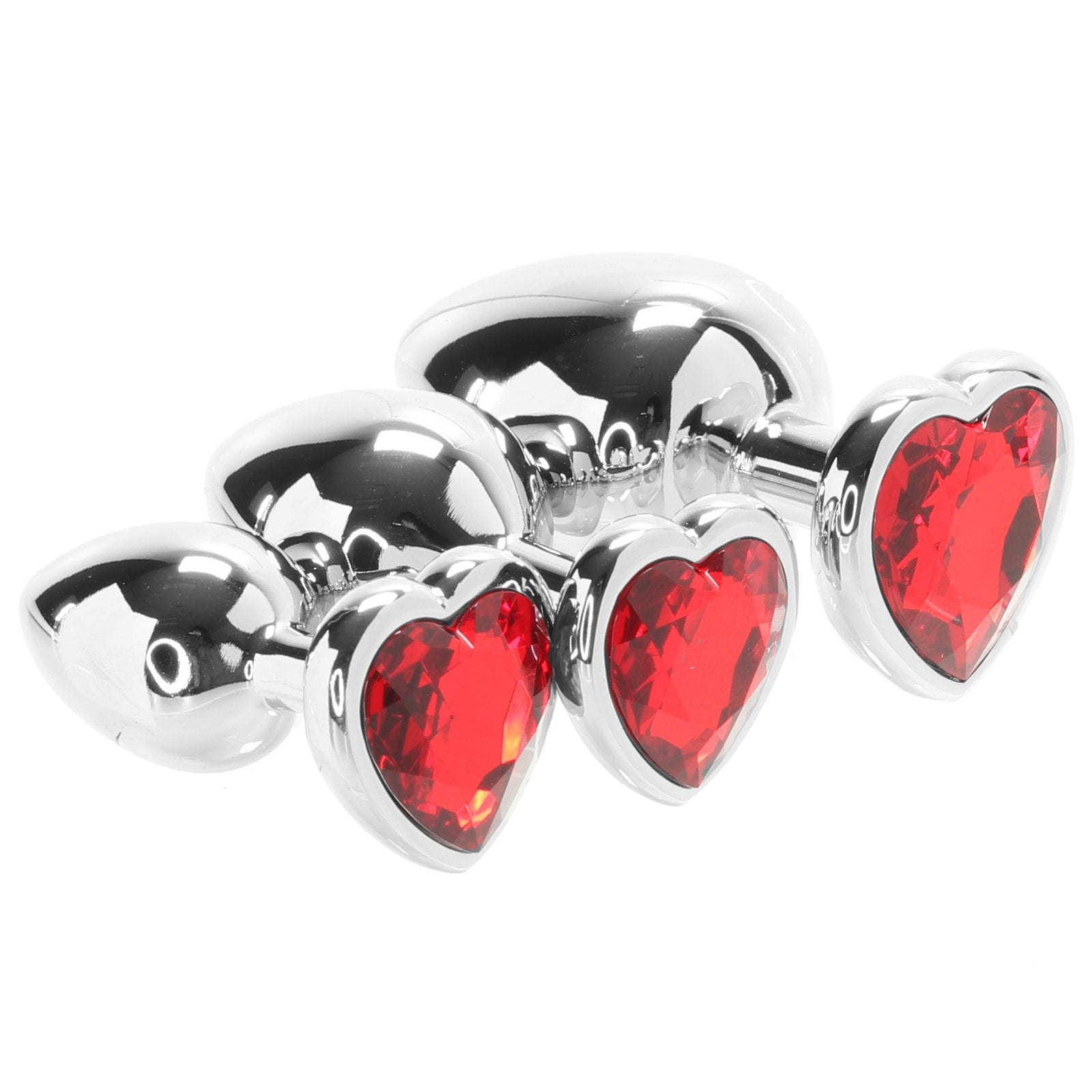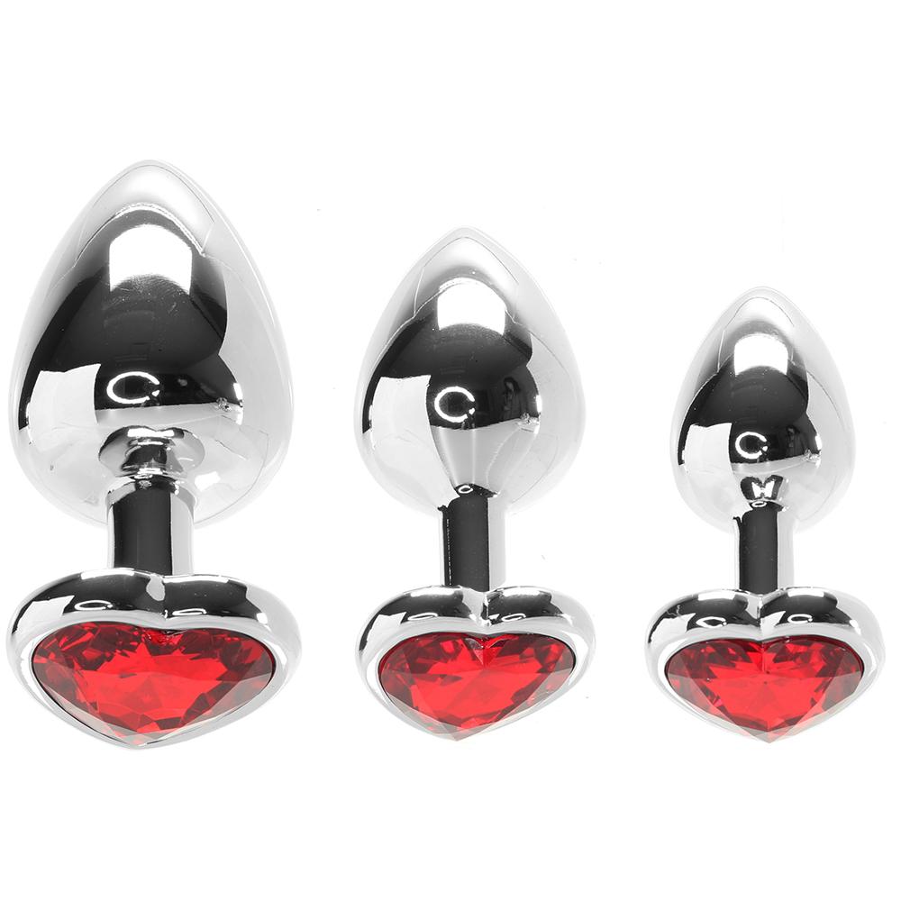 Inside, you'll find three classically tapered plugs in silvery, body-safe polished aluminum. They're each shaped for easy insertion, quick adjustments and removal, and each features a sexy (and namesake) glittery heart shaped gemstone at the base, but the similarities stop there. Size-wise, they're very different, all the better to help you work up to or dive right into butt play bliss.